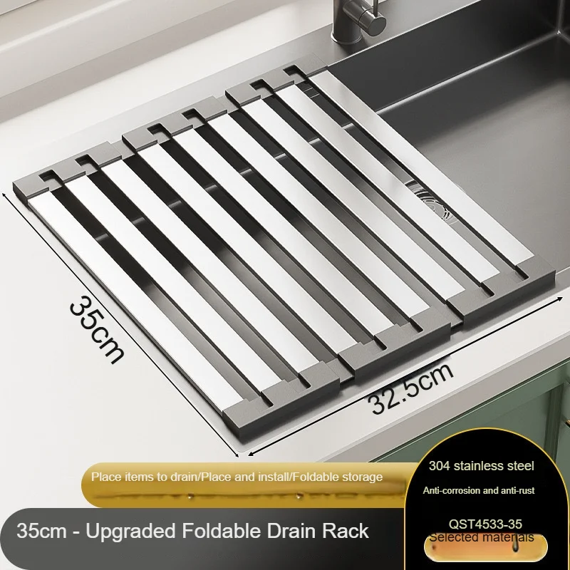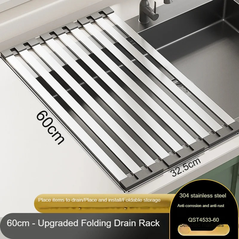 Foldable stainless steel sink drain rack, modern style, rectangular design, multifunctional rack for above sink, dish drain rack foldable kitchen storage rack with silicone edge
