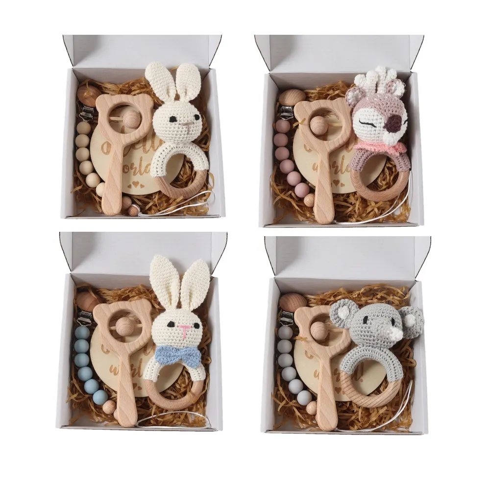 The gift set including one crochet rattle, one pacifier chain, one milestone, one bear wooden rattle.