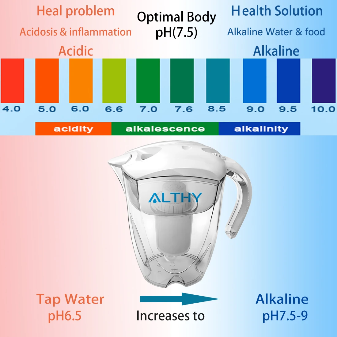 ALTHYโs Alkaline Water Pitcher produces slightly alkaline water to help restore potimal body pH and promote healthy living.