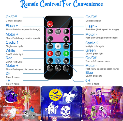 This kind of projector will come to you with a big remote control, which include many functions, such as speed-changing, color- changing, turn on/ off ocean wave. it is worthy to buy for your Halloween or Christmas day!