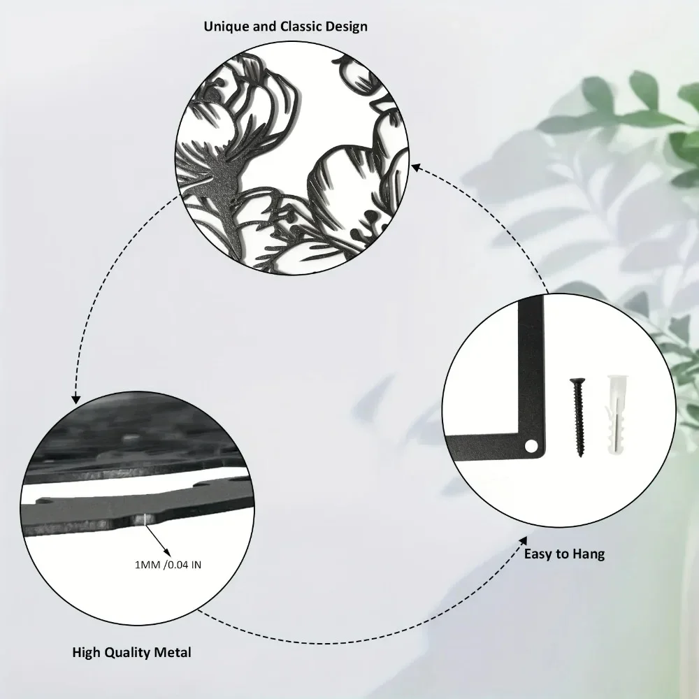 Hand-held rose metal black wall art sculpture is made of quality galvanized sheet metal. Two size is 24*30cm/9.4*11.8inches๏ผbig size is 32*40 cm/12.6*15.7 inches.